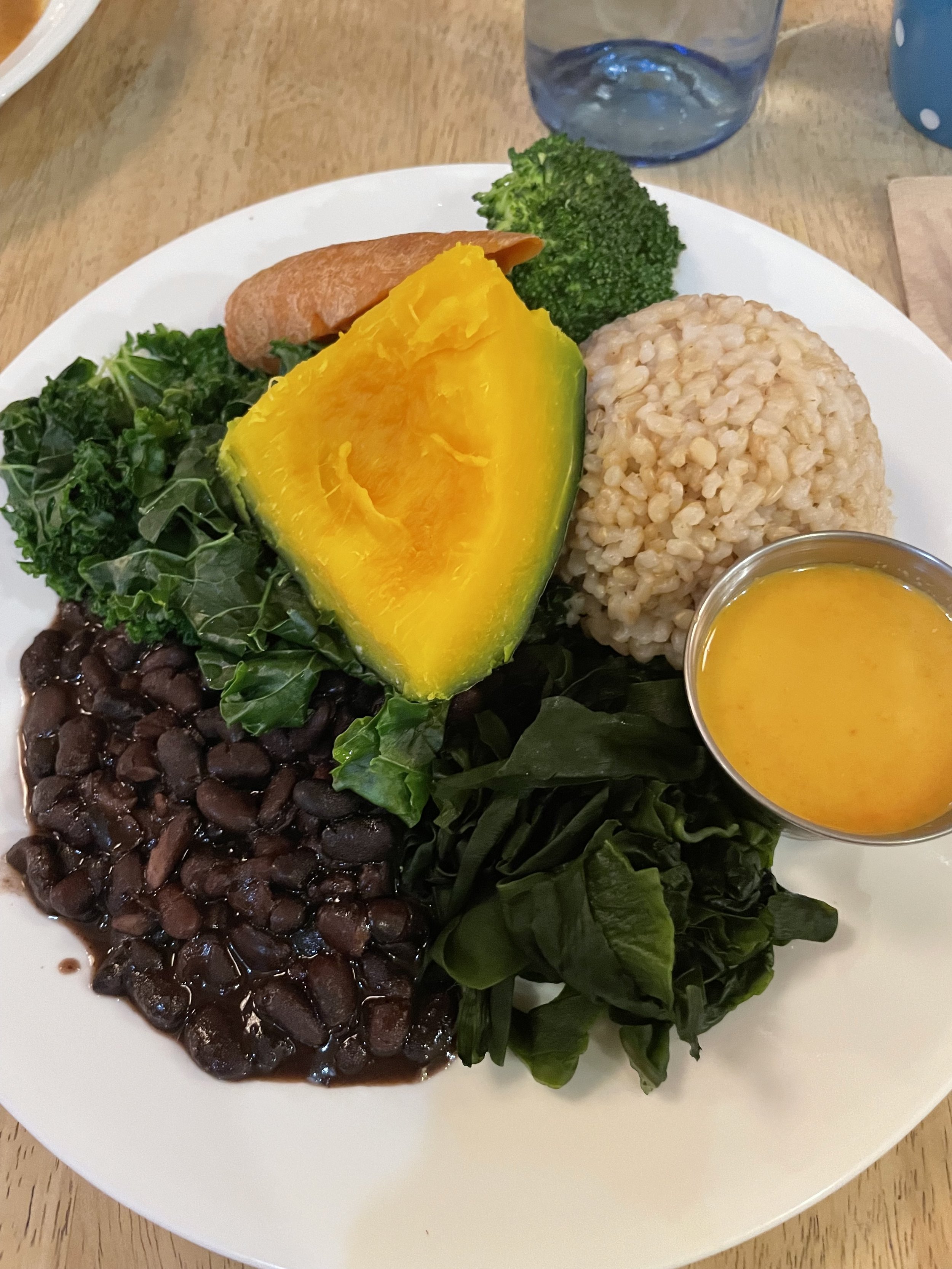 The Macro Plate is the only plate of steamed vegetables that I’ve enjoyed. I love vegetables, but growing up in England meant eating a lot of steamed Brussels sprouts, which didn’t make me feel healthy or particularly satisfied. The Macro Plates come with a serving of brown rice, kale, broccoli, wakame seaweed, kabocha (Japanese squash), and a vinaigrette of your choice- I would recommend the carrot ginger vinaigrette for a bright flavor or the miso tahini vinaigrette for a more savory, rich flavor. For an extra dollar, you can upgrade the brown rice to maze rice, which is cooked with burdock, mushrooms, and carrots (I highly recommend it).