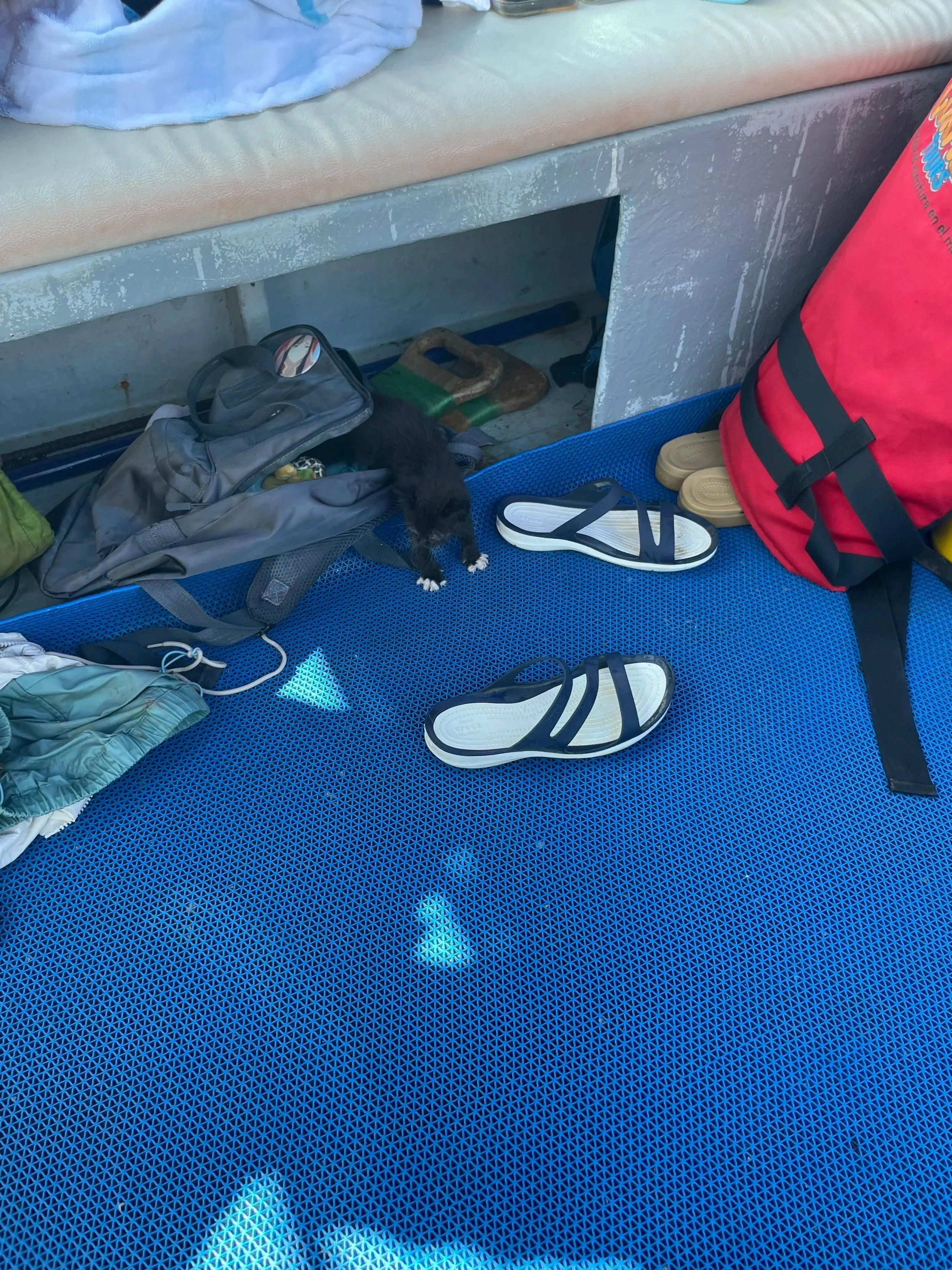We got on the boat and went out looking for dolphins that the crew had seen earlier in the morning. It was too late in the morning, so we set out around 10 am, and we went back to the pier to the flotilla of turtles. While we were out, we discovered a stowaway who had snuck onto the boat earlier that morning.